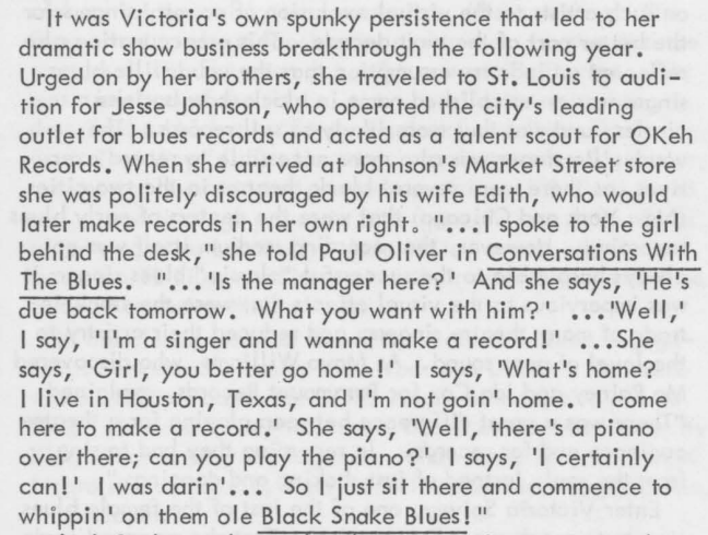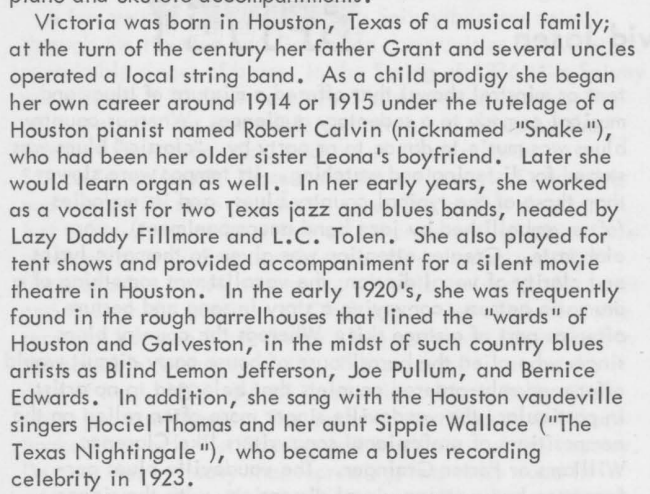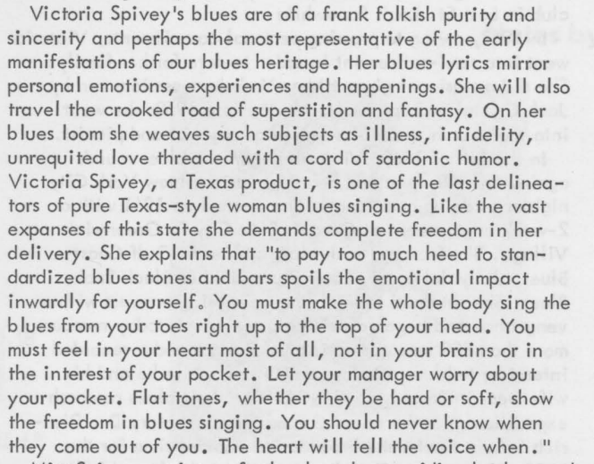 First, take some time to learn more about Victoria Spivey's life, music, and experiences by reading several excerpts from the liner notes that accompany her album, The Blues is Life.