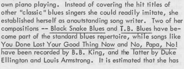 The first song she ever wrote and released, "Black Snake Blues"(1926), is one that inspired recordings by other well-known blues artists.