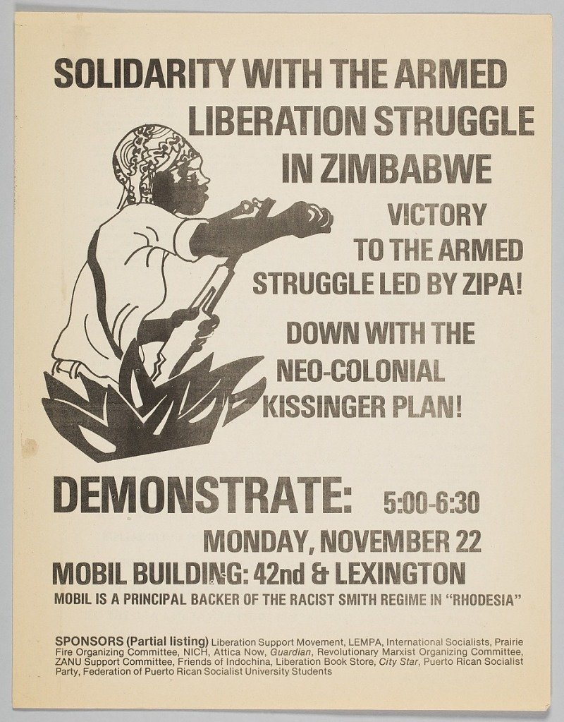 Flyer Advertising a Demonstration in Solidarity with Zimbabwean Liberation, by ZANU Solidarity Committee, The National Guardian, and the Puerto Rican Socialist Party. National Museum of African American History & Culture.