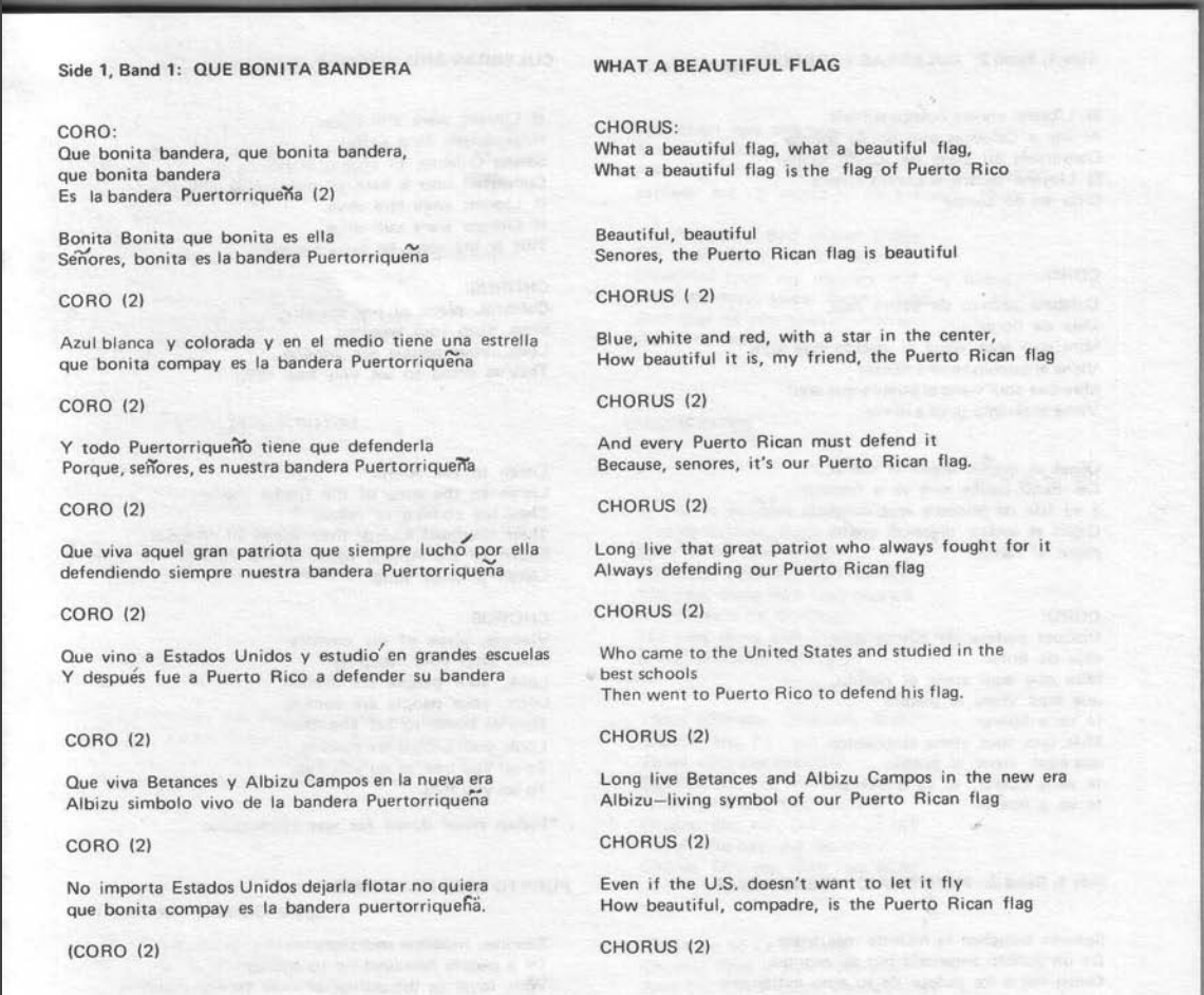 is a good opening song for this album. This plena ... is a very popular song among New York Puerto Ricans. About a year and a half ago, students at Bronx Community College were picketing their school ... Since someone had brought a flag ... we began singing this song. Everyone on the street, including the cops, laughed at us. 'Imagine singing that kind of song to a flag'; but their smiles disappeared when we replaced the American flag with the Puerto Rican flag. That's the point of course. When a country could not fly, its flag until 1956, that flag becomes part and parcel of its patriotic struggle for independence.