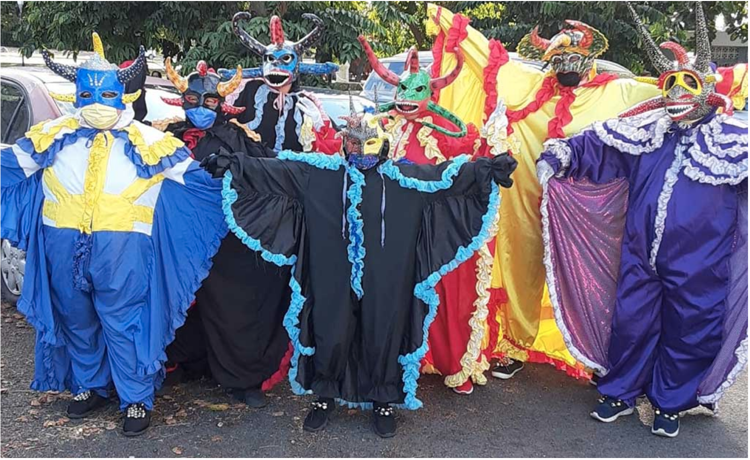 Vejigantes wear colorful masks with horns and a jump suit.