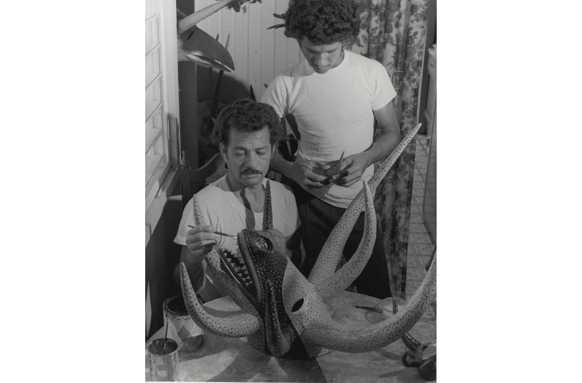 Left: Black and White Photo of Miguel Ángel Caraballo and his Son, Miguel, Painting a Mask, unknown photographer. Right: Carnival Mask, by Miguel Ángel Caraballo. National Museum of American History.