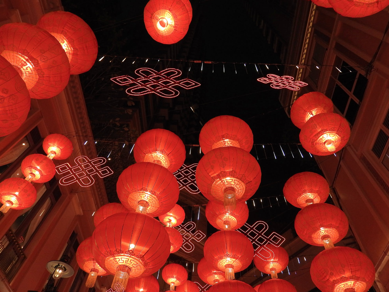 Chinese Lanterns with Garlands Hanging Between Buildings in Street, by John Lee, via Pexels.