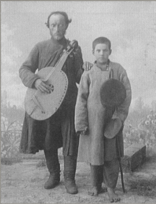 Kobzari were Ukrainian traveling musicians (often blind) who would play and sing as they travelled from village to village, especially during the nineteenth century (1800s).