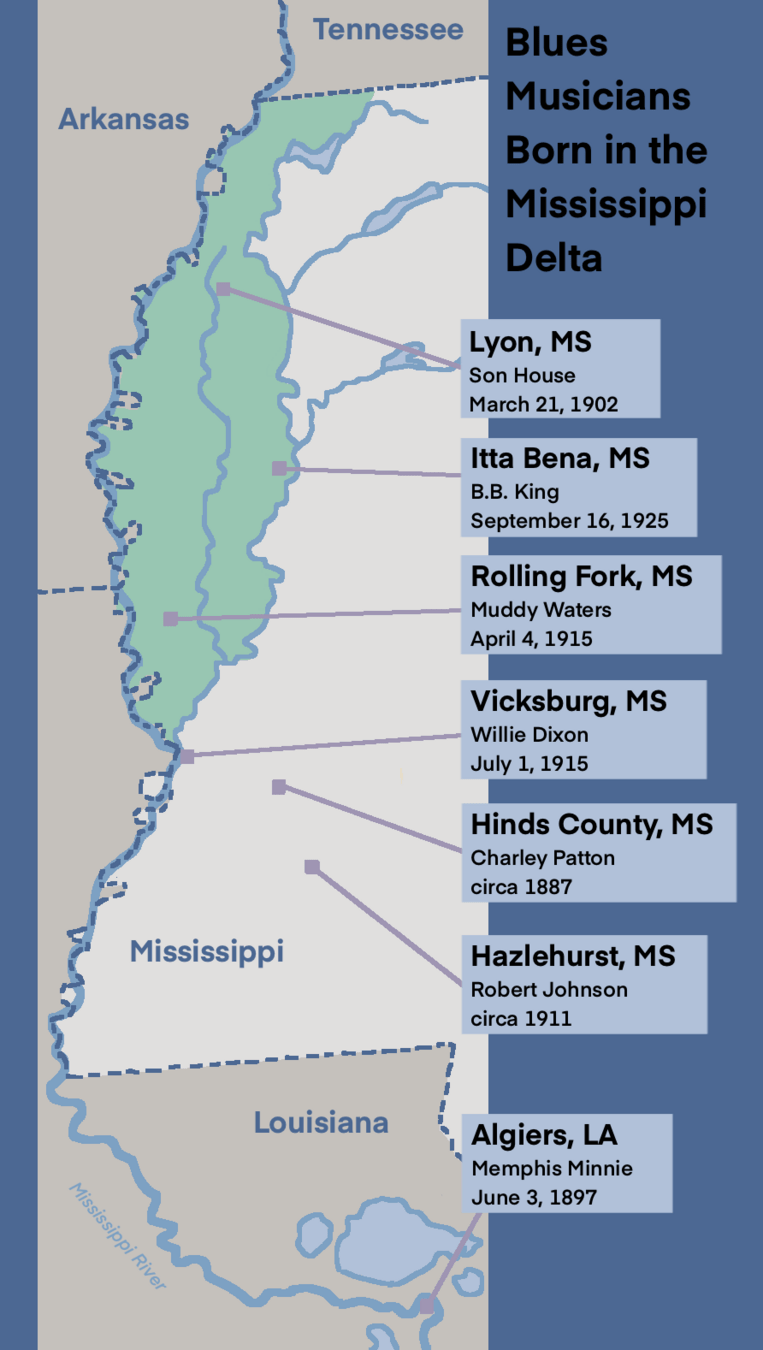 Mississippi Delta Blues Musicians Birth Map, by Danielle Nalangan. Smithsonian Folkways Recordings.