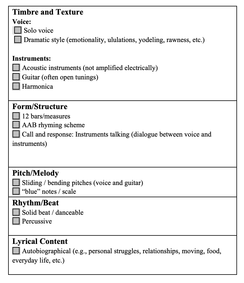 Check off the musical and stylistic characteristics you hear.