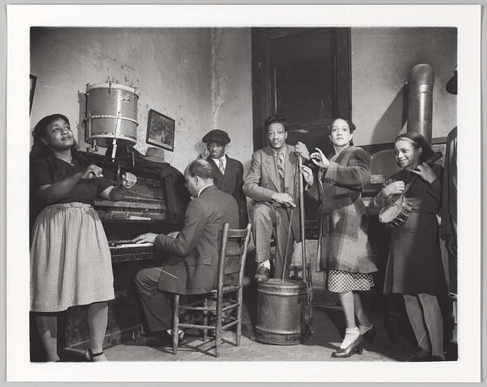 Left: Washtub Bass, unknown maker. National Museum of American History. Right: Red Willie Smith with Guitar, by Harold Courlander. Folkways Records.