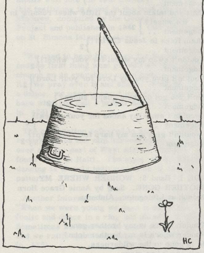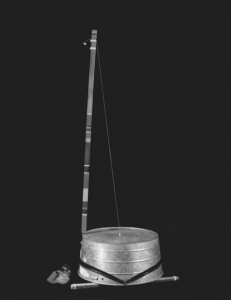 A stiff stick, usually a broomstick about four feet long, is braced against the lip at the outer diameter of the tub, and the string is attached to its upper end.