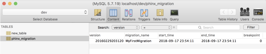 $ phinx migrate -e dev$ phinx migrate -e dev -t 20110103081132