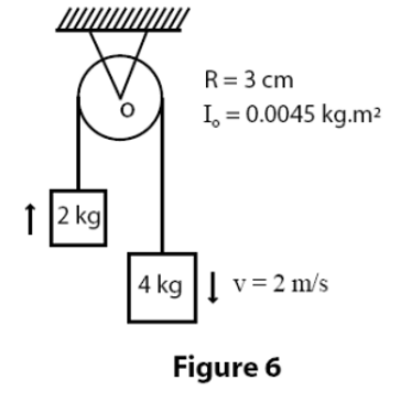 &\text{Fig.~6 shows a pulley } (R = 3.0~\text{cm} \text{ and } I_0 = 0.0045~\text{kg.m}^2) \text{ suspended from the ceiling.} \\