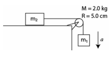&\text{and mass } M = 1.5~\mathrm{kg}. \text{ What is the linear acceleration of the block of mass } m_2? \\[4pt]
