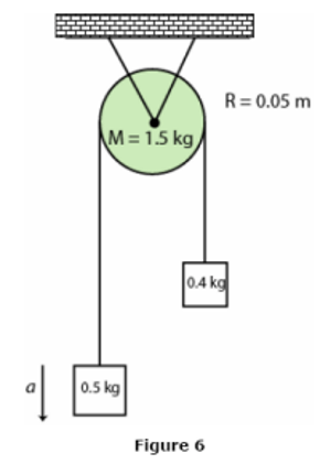 &\text{In Fig. 6, } m_1 = 0.50~\mathrm{kg},~ m_2 = 0.40~\mathrm{kg} \text{ and the pulley has a disk shape of radius } 0.05~\mathrm{m} \\