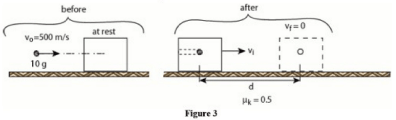 &\text{block of woodthat has a mass of } 5.0~\text{kg (see Fig.~3). The bullet embeds itself in the block.}\\