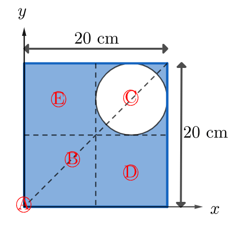 &\text{A circular hole of radius } r = 5.0~\text{cm is cut from a uniform square metal sheet of side } 20~\text{cm},\\