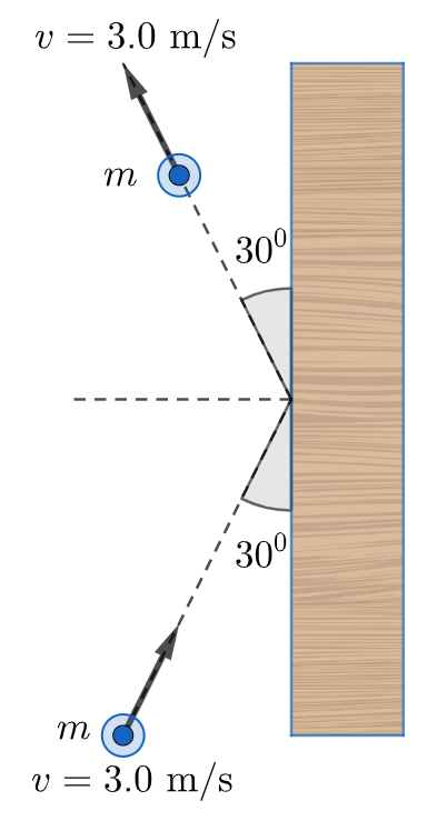 &\text{A } 1.0~\text{kg ball strikes a vertical wall at an angle of } 30^\circ \text{ with a speed of } 3.0~\text{m/s} \text{ and bounces}\nonumber \\