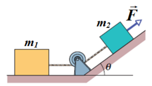 \displaystyle F-m_2g \cos (90^0-\theta)=(m_1+m_2) {a}