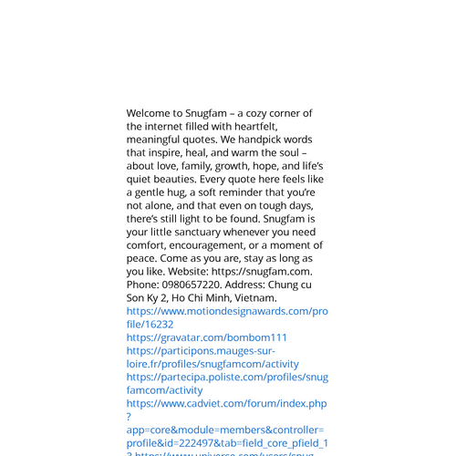 Website: https://snugfam.com. Welcome to Snugfam – a cozy corner of the internet filled with heartfelt, meaningful quotes. We handpick words that inspire, heal, and warm the soul – about love, family, growth, hope, and life’s quiet beauties. Every qu