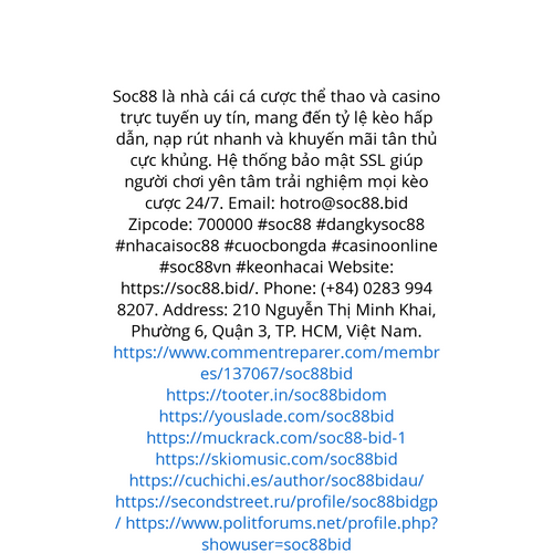 Website: https://soc88.bid/. Soc88 là nhà cái cá cược thể thao và casino trực tuyến uy tín, mang đến tỷ lệ kèo hấp dẫn, nạp rút nhanh và khuyến mãi tân thủ cực khủng. Hệ thống bảo mật SSL giúp người chơi yên tâm trải nghiệm mọi kèo cược 24/7. Email:
