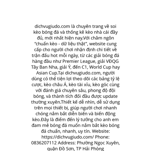 Website: https://dichvugiudo.com/ dichvugiudo.com là chuyên trang về soi kèo bóng đá và thống kê kèo nhà cái đầy đủ, mới nhất hiện nay.Với châm ngôn “chuẩn kèo - dữ liệu thật”, website cung cấp cho người chơi nhận định chi tiết về trận đấu hot mỗi ng