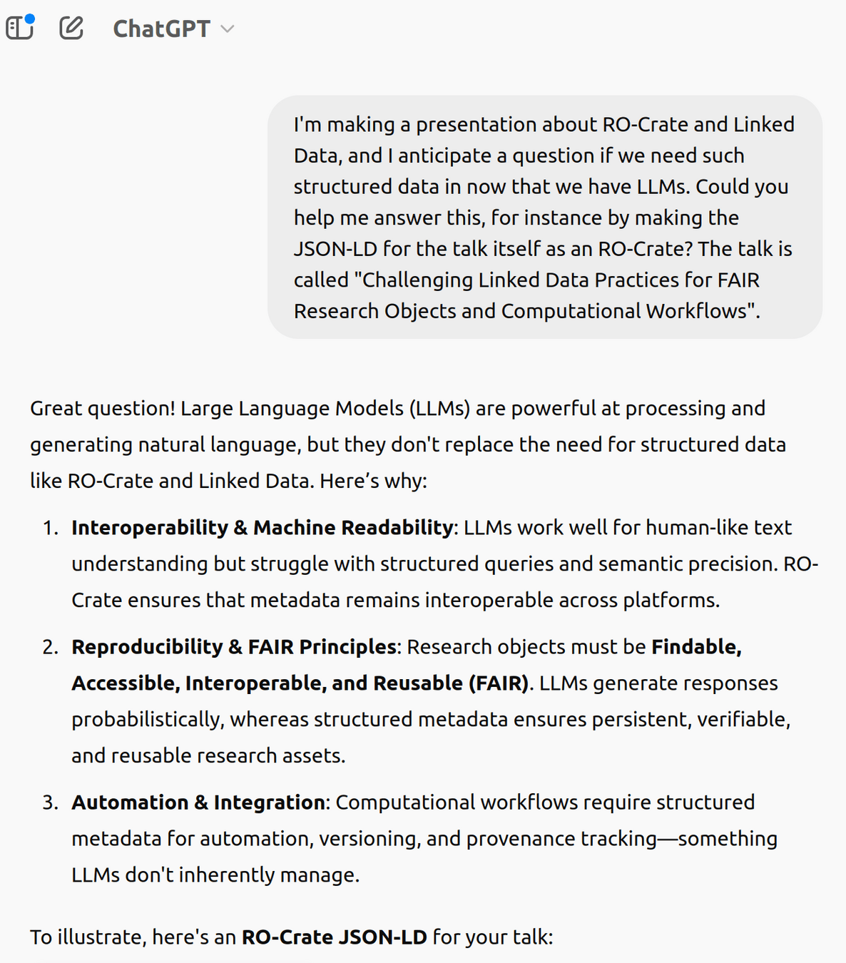 This RO-Crate exemplifies how structured data formats like JSON-LD and standards like RO-Crate enhance reproducibility, interoperability, and FAIRness in research. While LLMs can assist in generating or querying metadata, structured data remains essential for ensuring machine-actionability, provenance tracking, and long-term preservation of research outputs