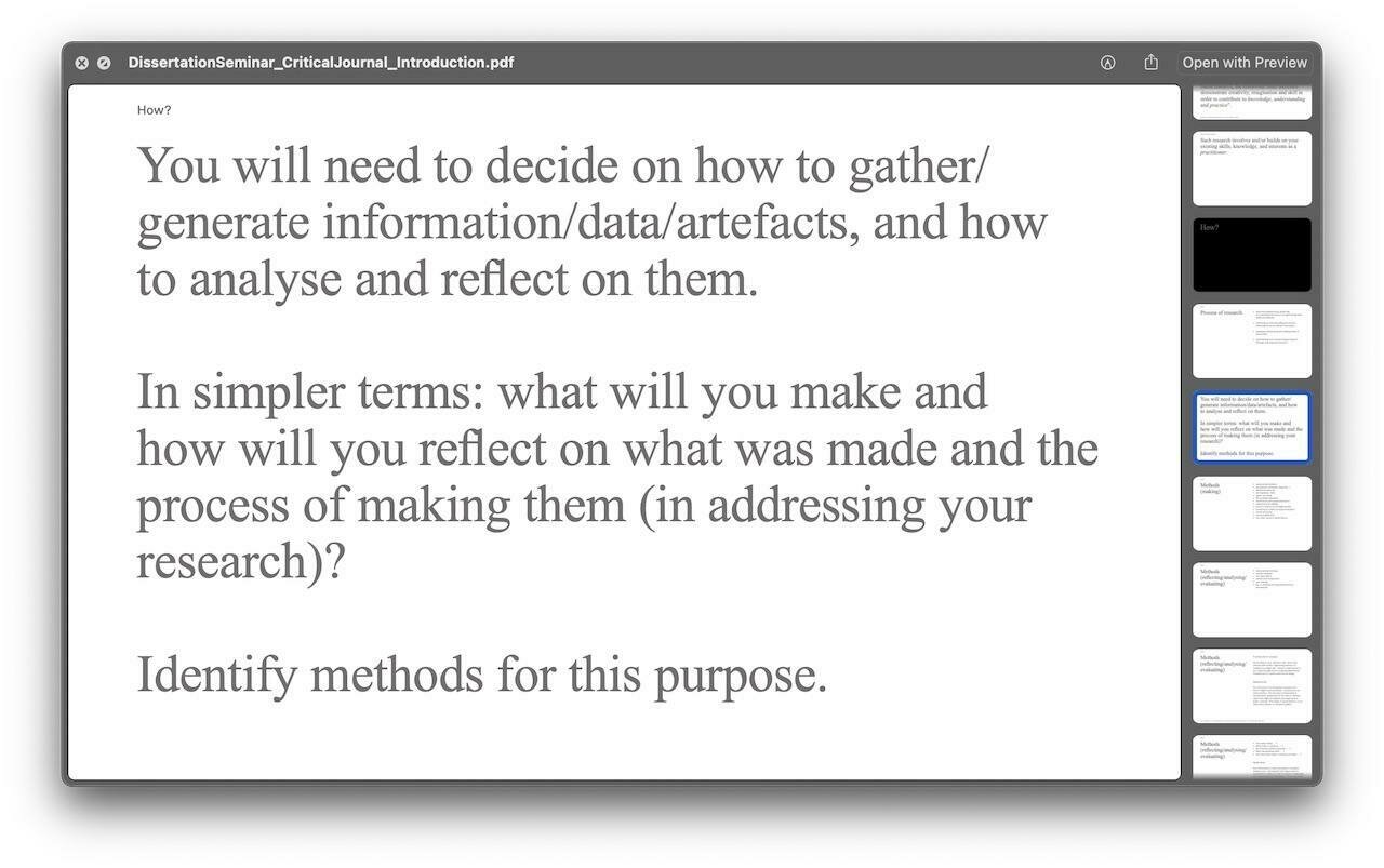 Students should ideally go back and forth between their dissertation and their practice. Both should be done in tandem. If the dissertation is done before engaging into practice, the practice merely becomes the ‘packaging’ of the research. New knowledge should emerge from practice as well. The design practice can be cross-fertilised with disciplines such as psychology, sociology, political science, communication studies, philosophy or literary studies, as well as performance arts, contemporary arts, music, or other design disciplines – but the core of the research must be anchored in design.