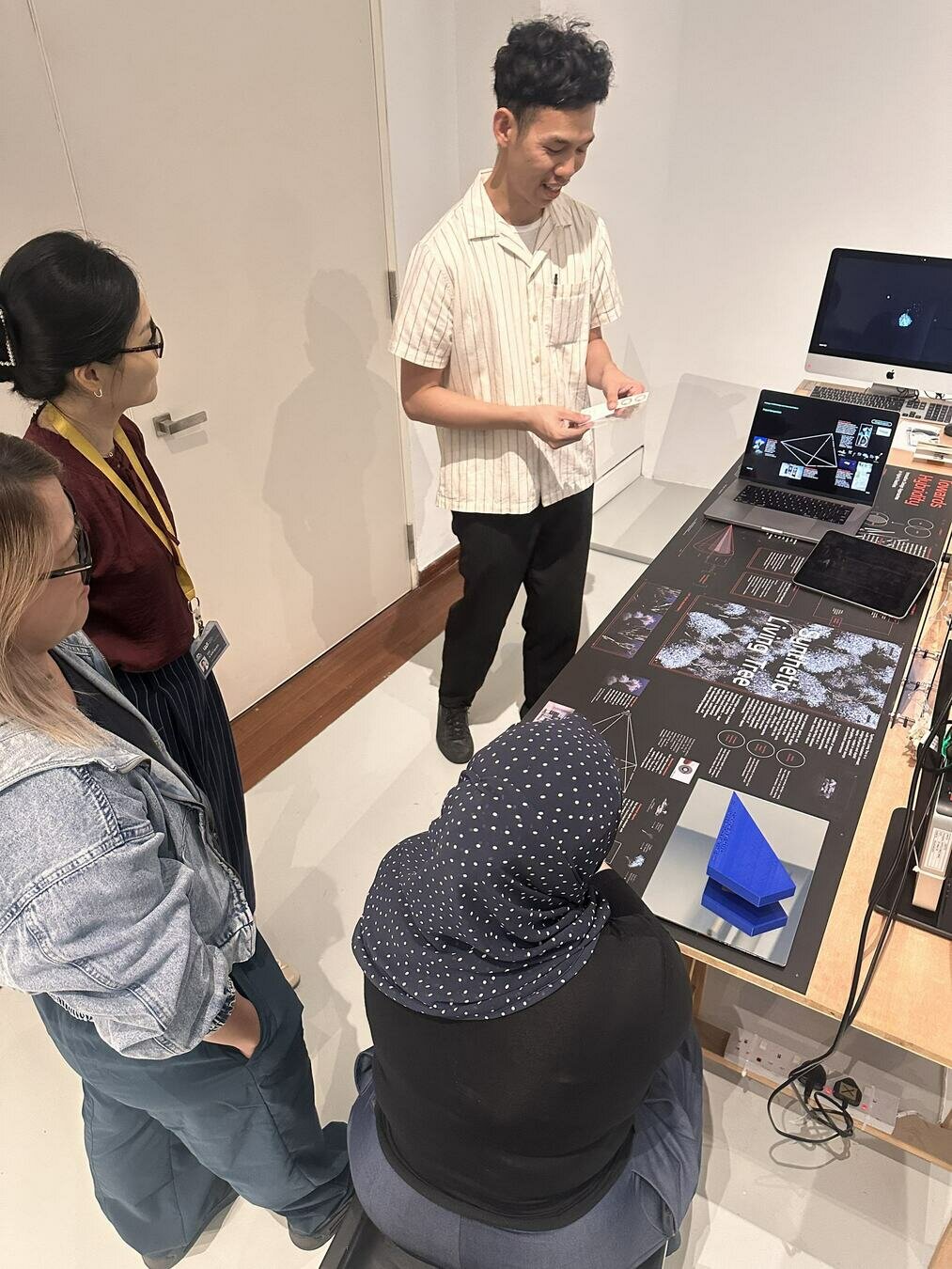 In action, in use: pictures of the work with people interacting or looking at the work. These photos can be staged and choreographed, or taken during a show and tell or exhibition with audience. Use a good camera, a tripod if necessary and adequate lighting.