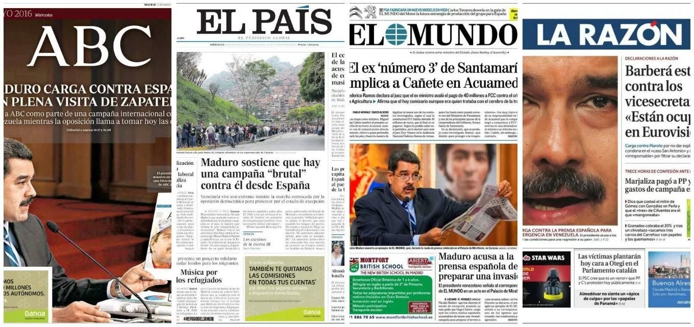 İspanya da yayımlanan sermaye yanlısı gazeteler de Venezuela manşetleri ile çıkıyor. Venezuela'nın Bolivarcı devlet başkanına karşı yürütülen medya savaşının onlar da bir parçası. Venezuela medyası ise ağırlıklı olarak muhalifleri destekliyor.