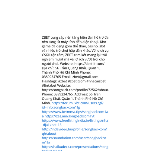 Website: https://songback.com/profile/72562/about. ZBET cung cấp nền tảng hiện đại, hỗ trợ đa nền tảng từ máy tính đến điện thoại. Kho game đa dạng gồm thể thao, casino, slot và nhiều trò chơi hấp dẫn khác. Với dịch vụ CSKH tận tâm, ZBET cam kết mang