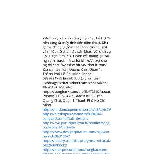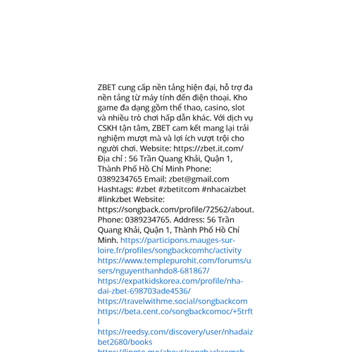 Website: https://songback.com/profile/72562/about. ZBET cung cấp nền tảng hiện đại, hỗ trợ đa nền tảng từ máy tính đến điện thoại. Kho game đa dạng gồm thể thao, casino, slot và nhiều trò chơi hấp dẫn khác. Với dịch vụ CSKH tận tâm, ZBET cam kết mang