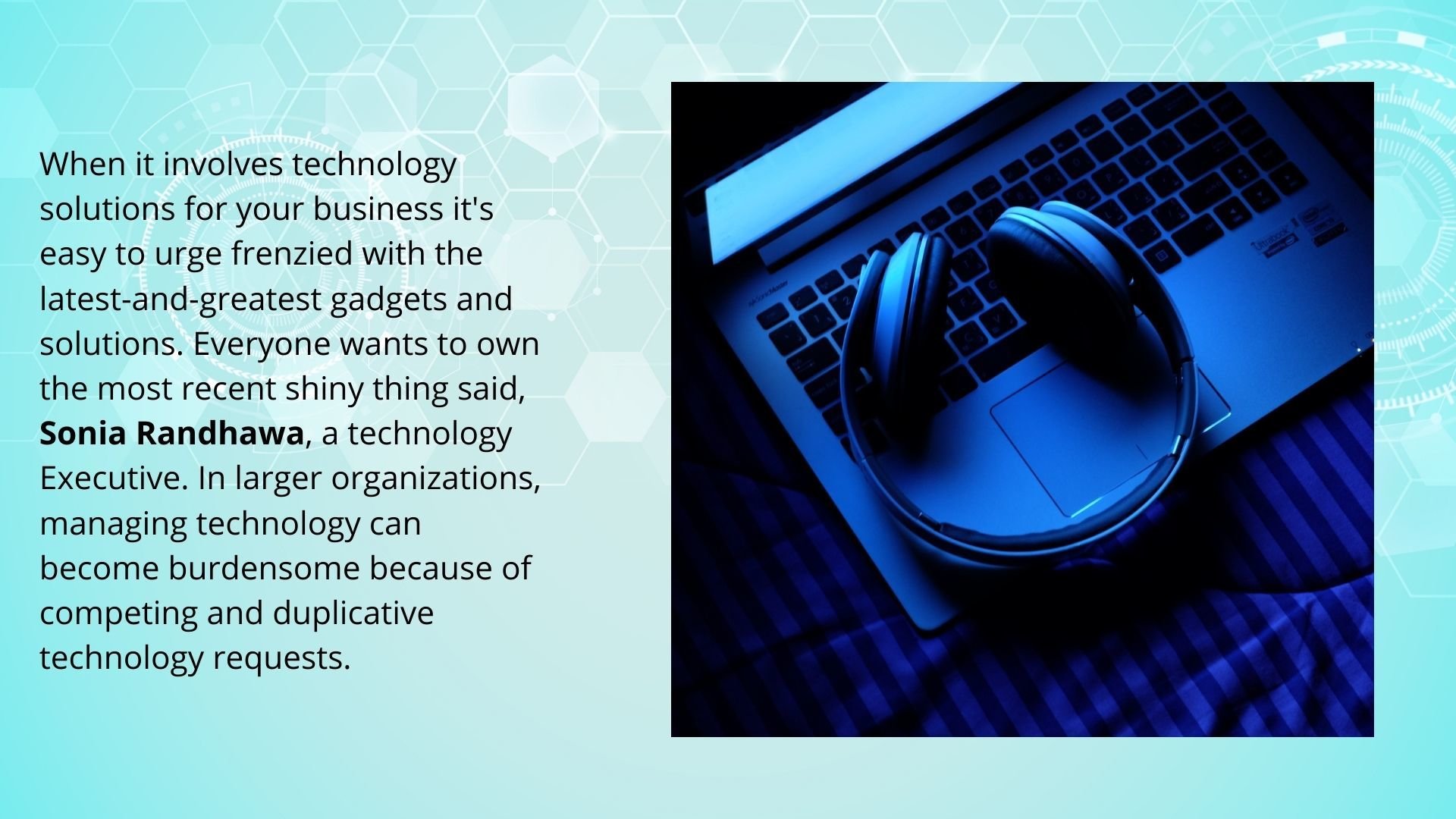 When it involves technology solutions for your business it's easy to urge frenzied with the latest-and-greatest gadgets and solutions. Everyone wants to own the most recent shiny thing said, Sonia Randhawa, a technology Executive. In larger organizations, managing technology can become burdensome because of competing and duplicative technology requests. https://github.com/sonirw
