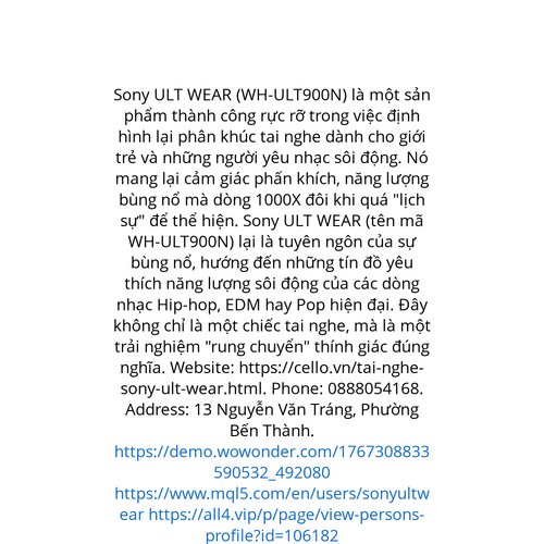 Website: https://cello.vn/tai-nghe-sony-ult-wear.html. Sony ULT WEAR (WH-ULT900N) là một sản phẩm thành công rực rỡ trong việc định hình lại phân khúc tai nghe dành cho giới trẻ và những người yêu nhạc sôi động. Nó mang lại cảm giác phấn khích, năng