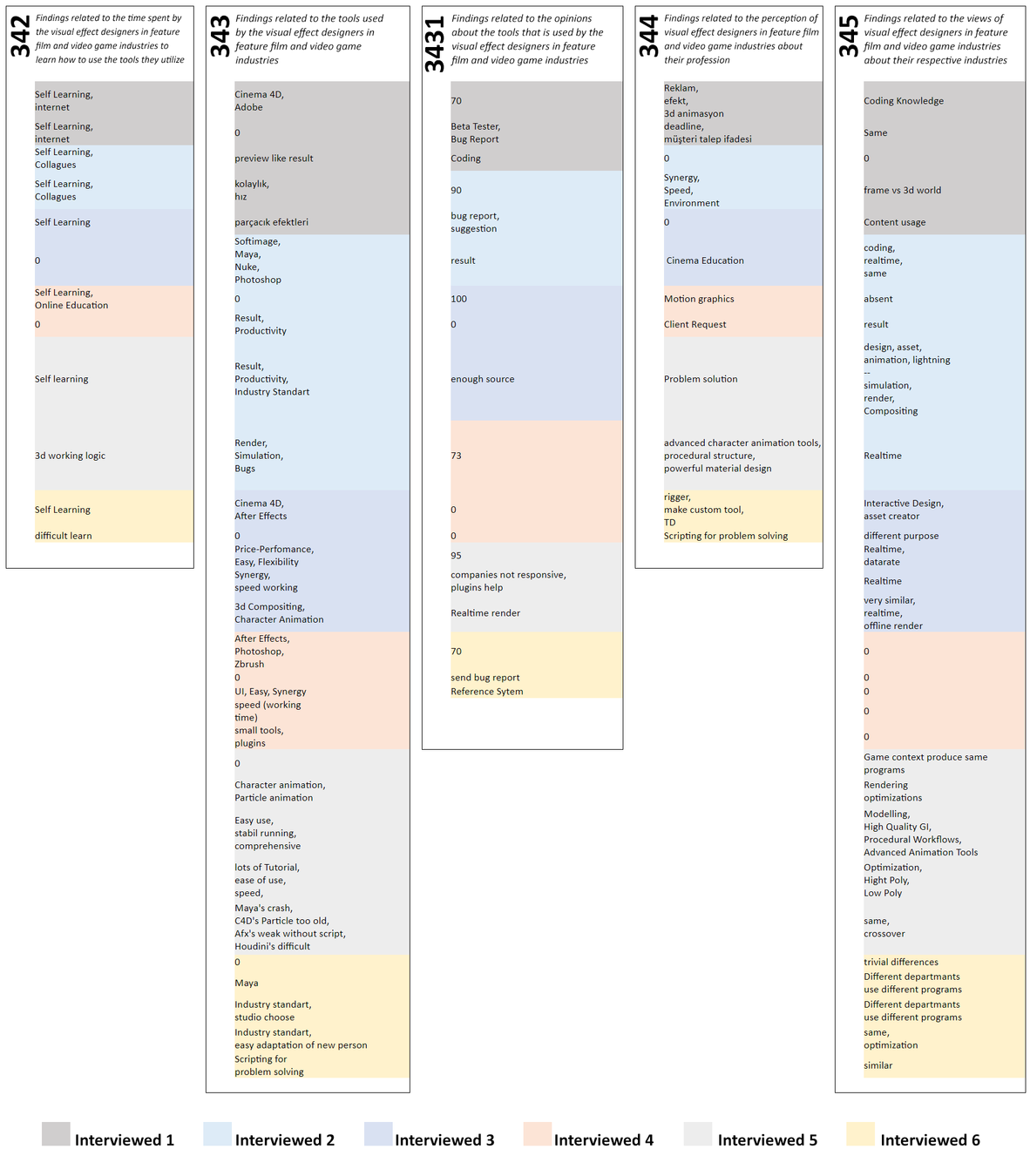 A comparative thematic analysis is made between the groups to determine the common and differentiated points of the data obtained from the visual effect designers in feature film and video game industries respectively.