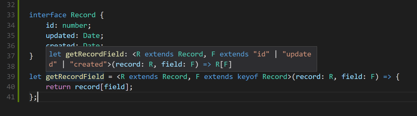 let getRecordField = <R extends Record, F extends keyof Record>(record: R, field: F) => {