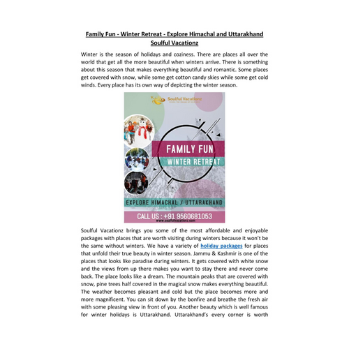Winter is the season of holidays and coziness. There are places all over the world that get all the more beautiful when winters arrive. There is something about this season that makes everything beautiful and romantic. Soulful Vacationz brings you some of the most affordable and enjoyable packages with places that are worth visiting during winters because it won’t be the same without winters. We have a variety of holiday packages for places that unfold their true beauty in winter season. https://www.soulfulvacationz.com/