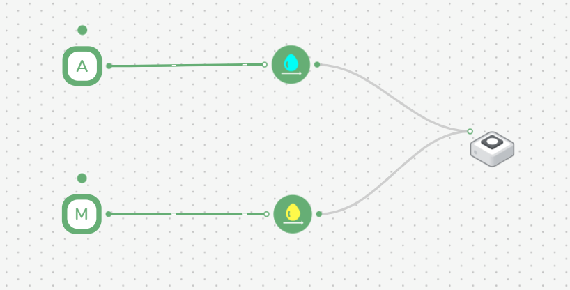 Ora dobbiamo effettivamente miscelare i due colori che abbiamo scelto. Per farlo, andiamo ad aggiungere un blocco logico AND, che creerà una nuova linea di flusso che si attiverà nel momento in cui premiamo i due tasti insieme.