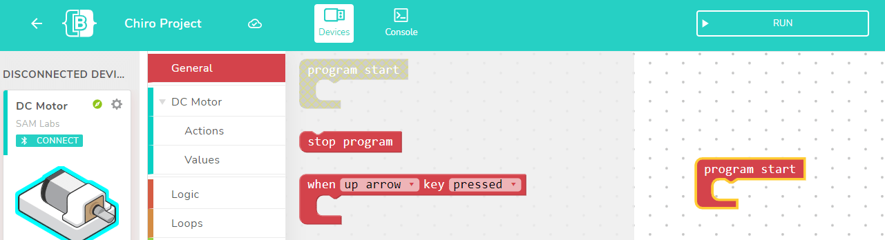 Il software di SAM Labs offre lo “Space”, cioé l’ambiente all’interno del quale operare con dei blocchetti e pulsanti di sistema.