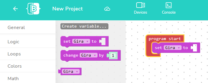 Per portare avanti il flusso, dobbiamo creare una variabile dal menù fucsia e la chiamiamo “Gira”.