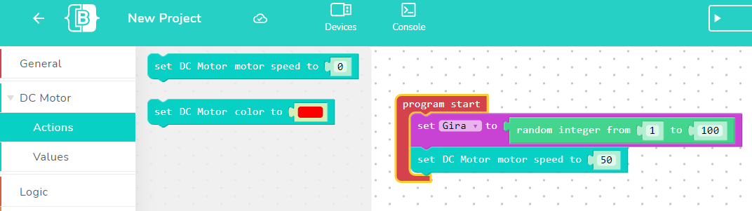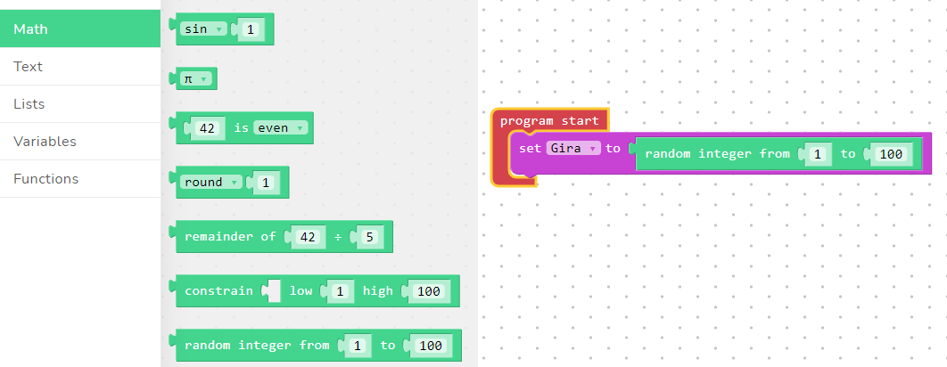 Dalla sezione “Math” aggiungiamo “random integer from 1 to 100”, mettendo un valore massimo a 5.