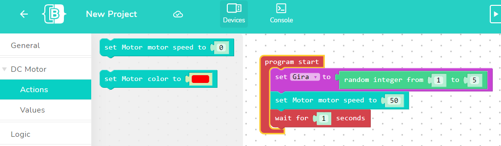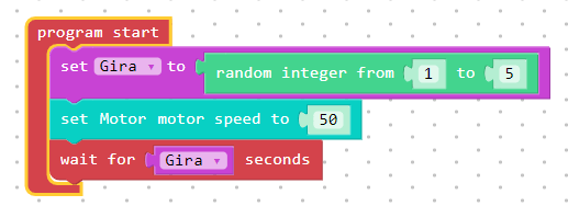 Infatti al posto di un valore prestabilito possiamo usare il valore generato casualmente tra 1 e 5: esso sarà il tempo che farà azionare il motore