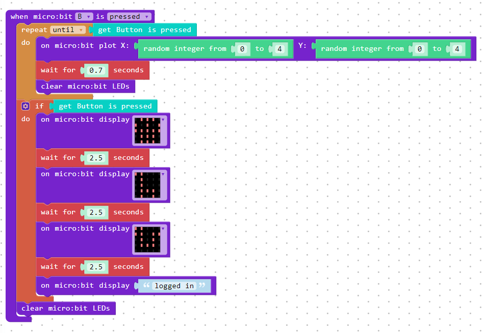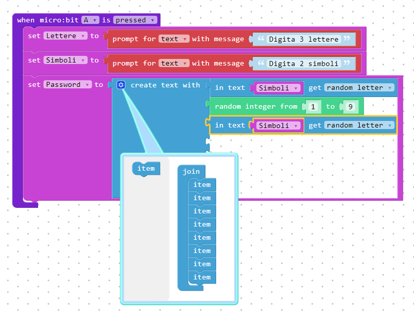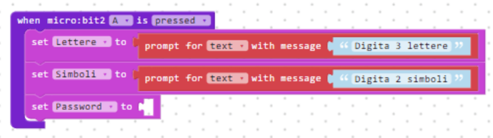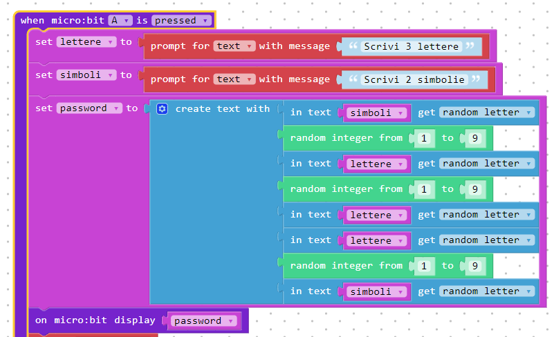 Per completare il tutto, ci maca solo l’input che permetterà di far comparire la password sul microbit; aggiungiamo quindi un “on micro:bit display” e mettiamo la variabile “Password”.