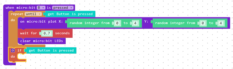 Nello Slot “do”, andiamo ad inserire da Micro:bit “on micro:bit plot x: y:” ed inseriamo due “random integer from 0 to 100” da math, cambiando 100 a 4.