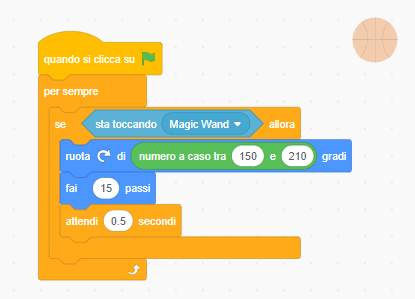 Dobbiamo ora fare in modo che la palla continui a muoversi, quindi prendiamo un blocco controllo “per sempre”, e mettiamo al suo interno due blocchi movimento, un “fai 15 passi” ed un “rimbalza quando tocchi il bordo”.