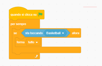 Dopo “Se”, inseriamo il blocco sensori “sta toccano puntatore del mouse”, mentre all'interno di “Se” aggiungiamo un blocco controllo “ferma tutto”.