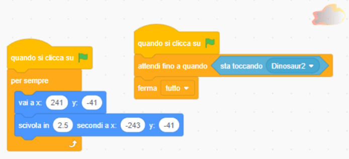 Come al solito selezioniamo il nostro “Quando si clicca su 🚩” e “per sempre”, per poi andare a selezionare il punto in cui far marciare il dinosauro grazie a “vai a x:-115 y:-12”.