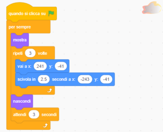 Passando a programmare, prendiamo i soliti pezzi iniziali quando si clicca e per sempre, per poi prendere vai ad x y. li mettiamo rispettivamente 241 e -41.