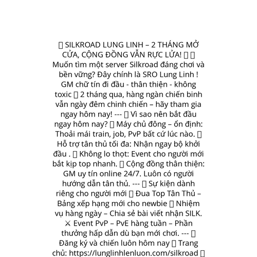 Website: https://lunglinhlenluon.com/silkroad/. 💥 Silkroad Lung Linh SRO – 2 THÁNG MỞ CỬA, CỘNG ĐỒNG VẪN RỰC LỬA! 🔥 💠 Muốn tìm một server Silkroad đáng chơi và bền vững? Chào mừng bạn đến SRO Lung Linh ! GM chữ tín đi đầu - thân thiện - không to