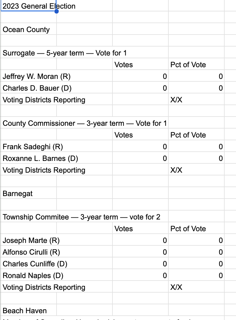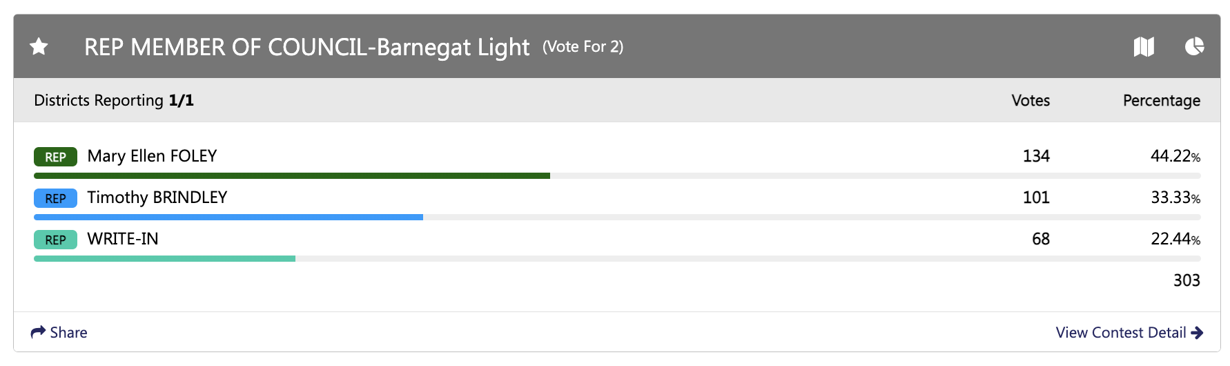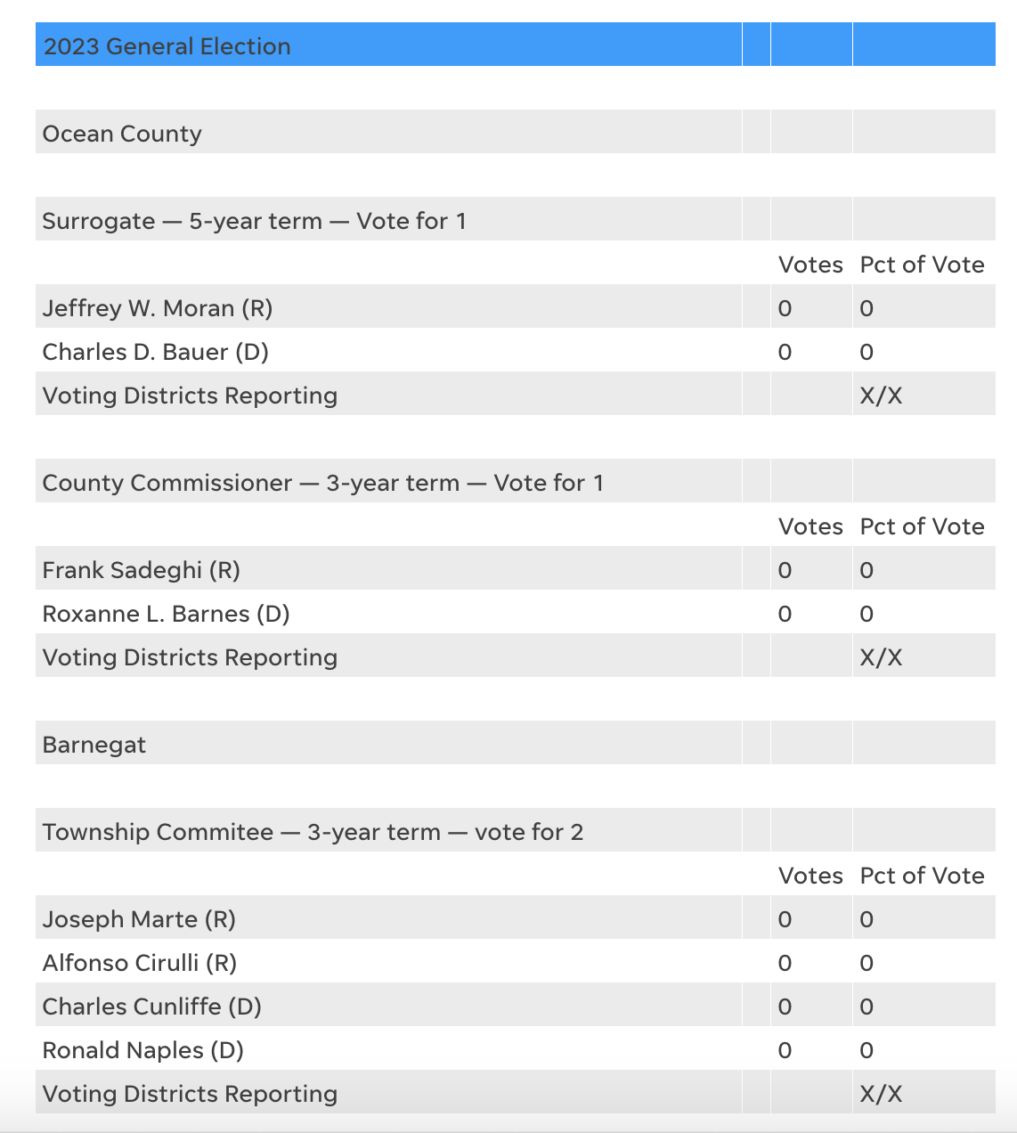 The Ocean County results pages look like this. Note: Ocean County uses a X/X display for districts reporting, instead of a percentage.