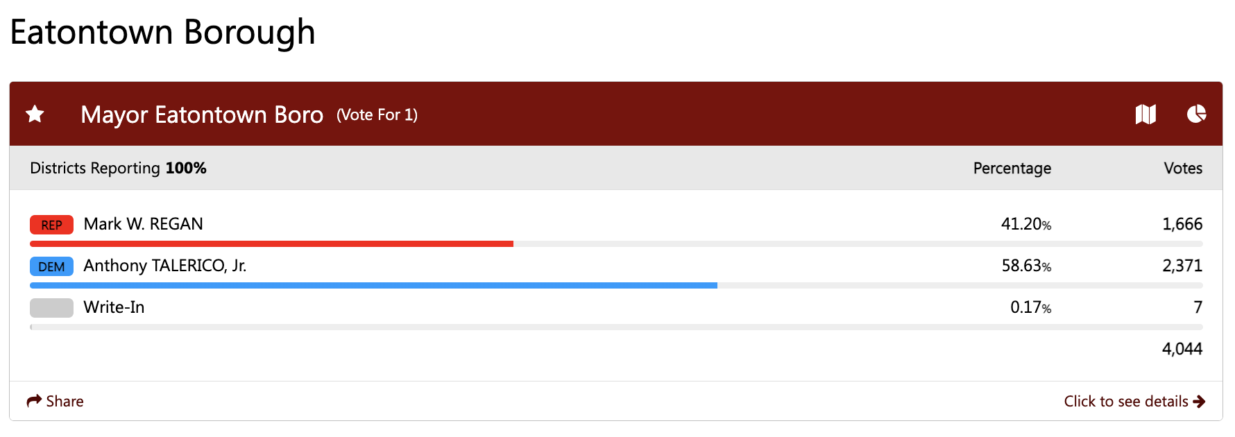 The Monmouth results pages look like this. Note: Monmouth County uses a percentage to track districts reporting.