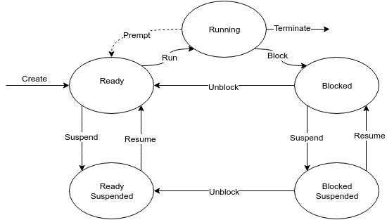 - Cada processo tem um estado e dependendo do estado o escalonador vai realizar diferentes tarefas com ele (inicializar, executar, encerrar).