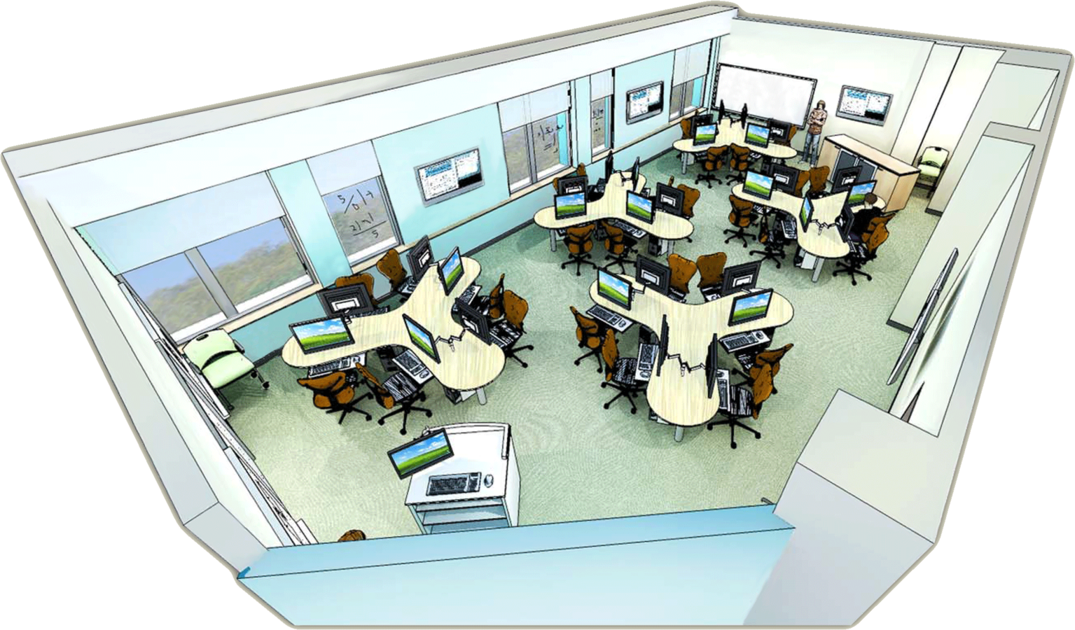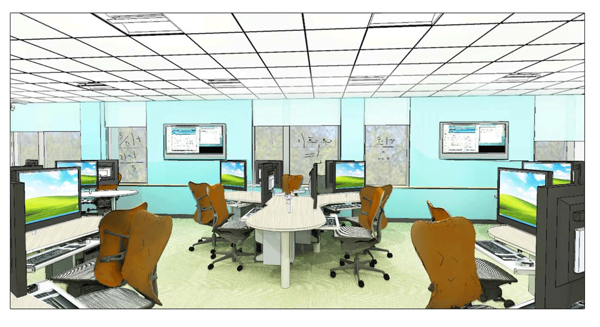 - Instructors Island with Crestron room controls, document camera, dual monitors, etc...